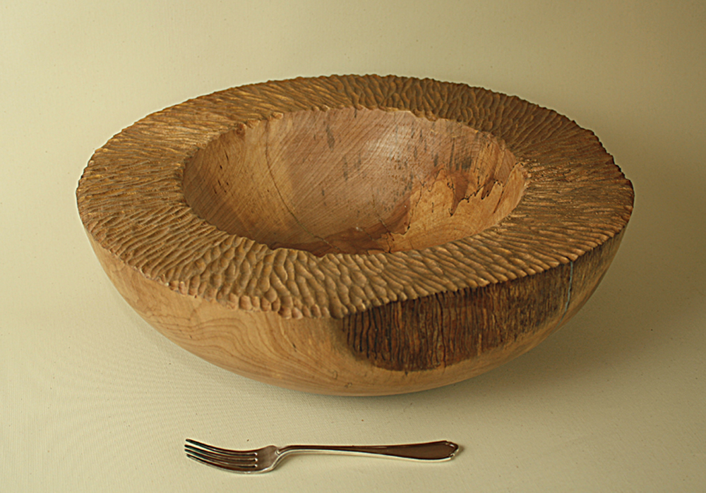 This was a slice from a Lime tree which had been felled to make room for a new Scout headquarters here in Newbury. It had been put on my "bulk pile" of logs and butts and after about a year I plucked up the courage to try to make a bowl out of it (the log weighed in excess of 40 kgs and was out of balance when I mounted it on the lathe). Having been brought in from outside in the weather, it naturally dried out during the turning process, and some small cracks appeared. These were filled with powdered brass and aluminium and resin. The wood was beginning to spalt and also showed some attractive colour variation. I hand carved the rim and finished it with gilding cream. The bowl was finished with seven coats of Danish Oil and a light coat of beeswax.
